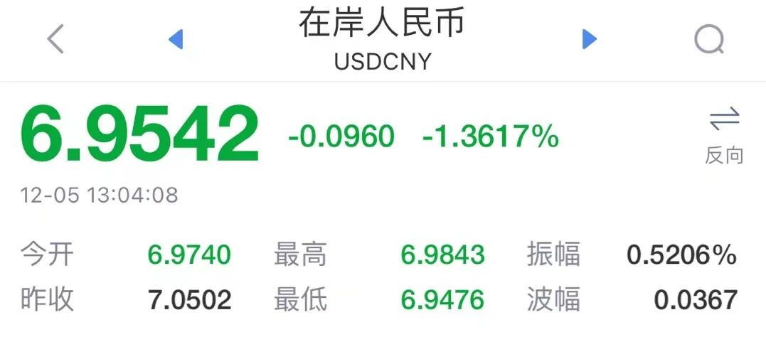 5日,人民幣匯率持續(xù)升值,離岸人民幣對(duì)美元匯率日內(nèi)上漲超600基點(diǎn),率先漲回至7.0關(guān)口上方。截至發(fā)稿,離岸人民幣對(duì)美元匯率報(bào)6.9511。