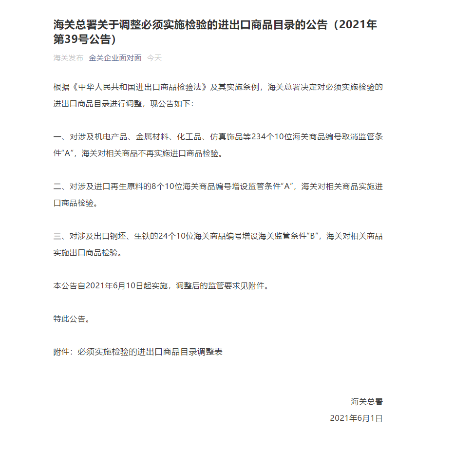 海關(guān)總署關(guān)于調(diào)整必須實施檢驗的進出口商品目錄的公告(2021年第39號公告)