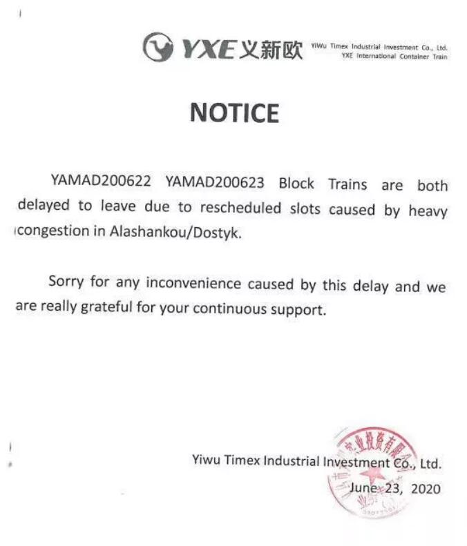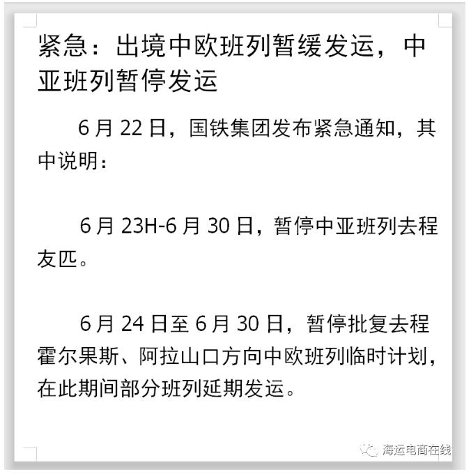 6月24日—6月30日,暫停批復(fù)去程霍爾果斯、阿拉山口方向中歐班列臨時計劃,以及在此期間部分班列延期發(fā)運(yùn)。