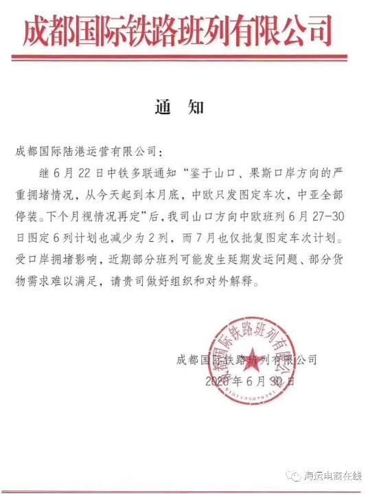 時間剛好過去一個星期,據(jù)悉,中歐班列、中亞班列的發(fā)運(yùn)情況并沒有好轉(zhuǎn)。6月30日,成都國際鐵路班列有限公司再發(fā)通知,通知中稱鑒于山口、果斯口岸方向的嚴(yán)重?fù)矶虑闆r,從即日起到7月底,中歐只發(fā)圖定車次,中亞全部停裝。何時恢復(fù)正常發(fā)運(yùn),下個月視情況再定。其實在6月27-30日期間,山口方向中歐班列,圖定的6列計劃已經(jīng)減少為2列,而且7月份也僅批復(fù)圖定車次計劃。該公司再次聲明受到口岸擁堵的直接影響,近期部分班列可能發(fā)生延期發(fā)運(yùn)問題、部分貨物的物流需求難以及時滿足,請相關(guān)部門人士做好組織和對外解釋。