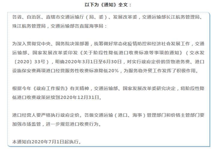 交通部此前解讀稱,將政府定價(jià)的貨物港務(wù)費(fèi)和港口設(shè)施保安費(fèi)收費(fèi)標(biāo)準(zhǔn)分別降低20%,預(yù)計(jì)港口企業(yè)將為貨主企業(yè)減輕負(fù)擔(dān)3.8億元,將為疫情期間穩(wěn)外貿(mào)工作發(fā)揮積極作用。