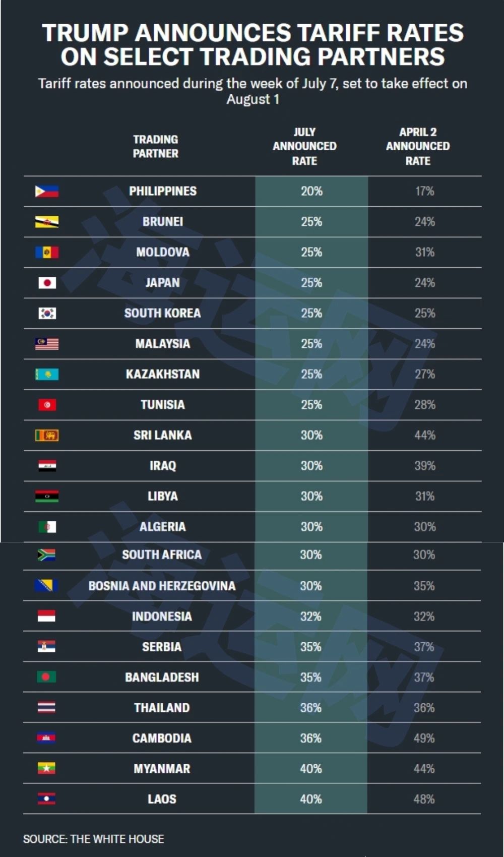 7月9日深夜,美國(guó)總統(tǒng)特朗普公布新一輪關(guān)稅通知函,對(duì)菲律賓、利比亞、阿爾及利亞和伊拉克等國(guó)征收20%至30%不等的關(guān)稅。宣布計(jì)劃自8月起,對(duì)未能與美國(guó)達(dá)成協(xié)議的貿(mào)易伙伴的進(jìn)口商品征收關(guān)稅,這標(biāo)志著其4月份宣布暫停征收的“互惠”關(guān)稅正式結(jié)束。