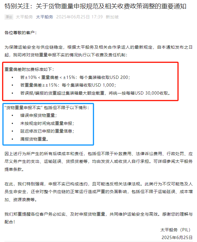 繼萬(wàn)海航運(yùn)6月16日發(fā)布通知,重申客戶須如實(shí)正確申報(bào)貨物,若存在瞞報(bào)、漏報(bào)、錯(cuò)報(bào)等申報(bào)不實(shí)行為,承運(yùn)人將按運(yùn)輸合同約定向貨方收取每單位10萬(wàn)美元違約金后;6月25日,新加坡船公司太平船務(wù)PIL發(fā)布重要通知,為保障運(yùn)輸安全與供應(yīng)鏈穩(wěn)定,依據(jù)公司及相關(guān)合作承運(yùn)人最新規(guī)定,自通知發(fā)布日起,將對(duì)貨物重量申報(bào)不實(shí)情況執(zhí)行收費(fèi)及責(zé)任機(jī)制。重量偏差附加費(fèi)標(biāo)準(zhǔn)明確:若重量偏差在±10%至±15%之間,每個(gè)集裝箱收取200美元;若偏差≥±15%,每個(gè)集裝箱收取1000美元;若誤報(bào)/瞞報(bào)貨重超過(guò)集裝箱最大額定載重,統(tǒng)一按每箱30000美元收取。