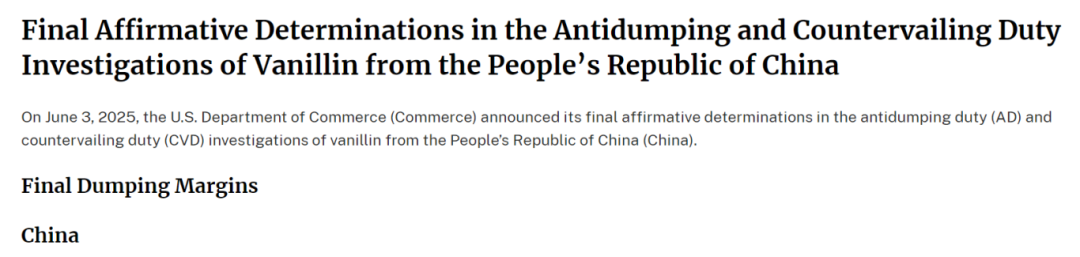 美國商務(wù)部稱中國進(jìn)口的香草醛以傾銷價格在美國銷售,并獲得了補(bǔ)貼。原文如下: