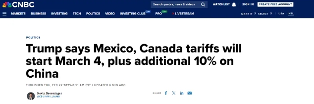 據(jù)美國CNBC美東時間2月27日8:51分報道,美國總統(tǒng)特朗普當日表示,3月4日正式對加拿大和墨西哥加征25%的關稅,將在同一天對中國額外再加征收10%的關稅。