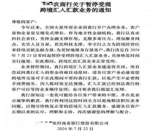 為更好地服務(wù)存量客戶,**農(nóng)商行決定自2024年7月23日零時起暫停受理跨境匯入?yún)R款業(yè)務(wù),具體恢復(fù)時間另行通知。