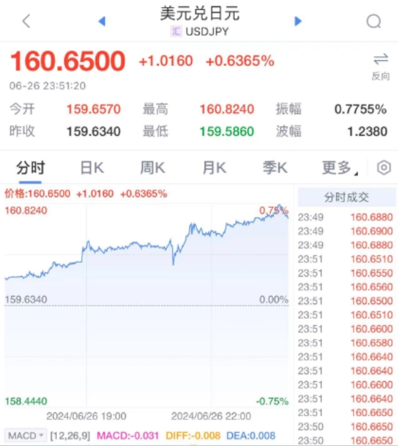 日元又崩了!26日晚最大的海外市場消息就是,日元又新低了!6月26日消息,據(jù)日本共同社報(bào)道,在26日的外匯市場上,日元匯率驟降,直接跌破160關(guān)口,甚至一度跌至1美元兌160.65日元。刷新1986年12月以來最低紀(jì)錄,跌至38年最低。