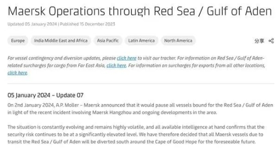 2023年12月30日,“馬士基杭州”輪在從新加坡到埃及蘇伊士港途經(jīng)曼德海峽時(shí)遇襲,馬士基當(dāng)時(shí)決定在未來48小時(shí)暫停經(jīng)過該地區(qū)的航行。