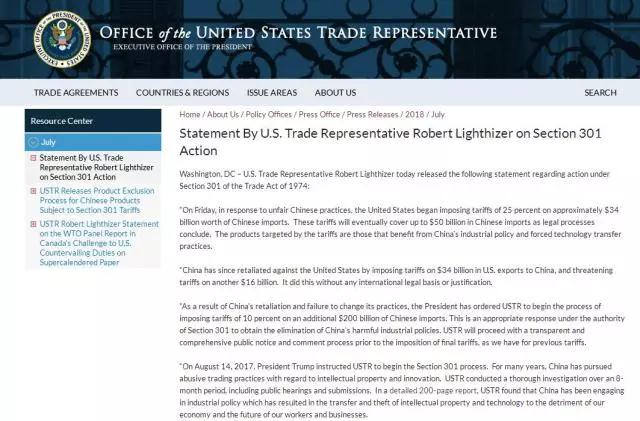 美國貿(mào)易代表羅伯特·萊特希澤在301行動(dòng)中的發(fā)言
