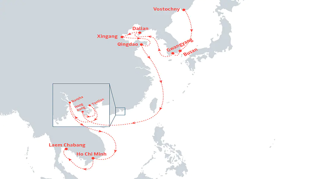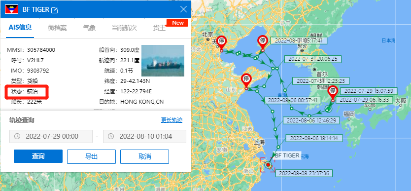 該輪曾于7月10-1日靠泊天津新港,7月19-20日靠泊上海港,7月22-23日靠泊廈門港,7月24-25日靠泊香港港,7月25-26日靠泊深圳蛇口港,然后駛往新加坡、科倫坡、那瓦希瓦、皮帕瓦沃港。涉及ANL、CMA CGM、CNC、COSCO SHIPPING、EVERGREEN、GOLD STAR LINE、HAMBURG SüD、KAMBARA KISEN、OOCL、PIL、ZIM等船公司共艙。