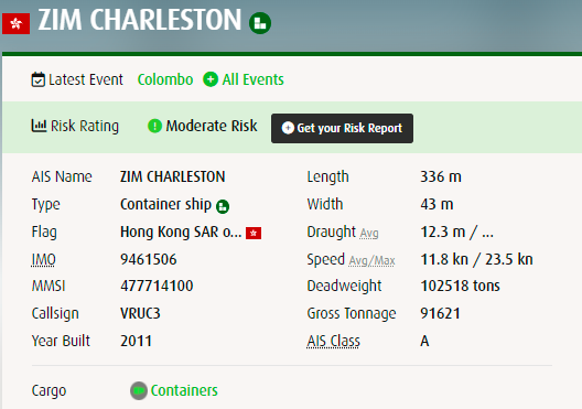 集裝箱船“ZIM CHARLESTON”建造于2011年,懸掛香港區(qū)旗,運力8586TEU,服務(wù)于以星亞洲內(nèi)部的China India Express III (CI3)航線,事發(fā)時執(zhí)行7W航次。7月份駛離中國前曾掛靠國內(nèi)多個港口。