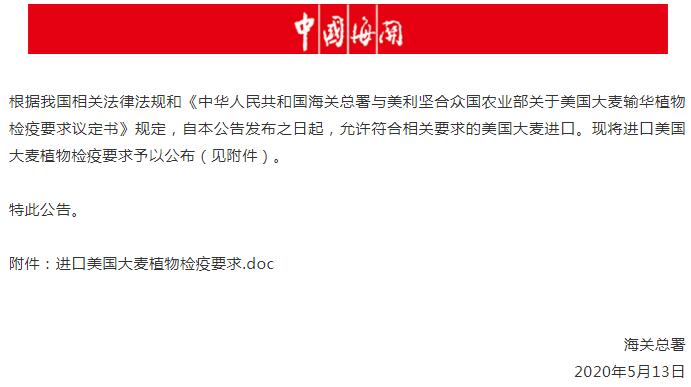 (三)《中華人民共和國海關總署與美利堅合眾國農(nóng)業(yè)部關于美國大麥輸華植物檢疫要求議定書》。