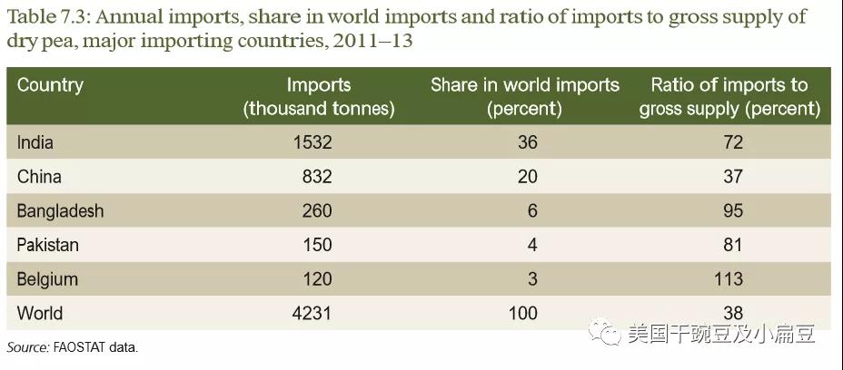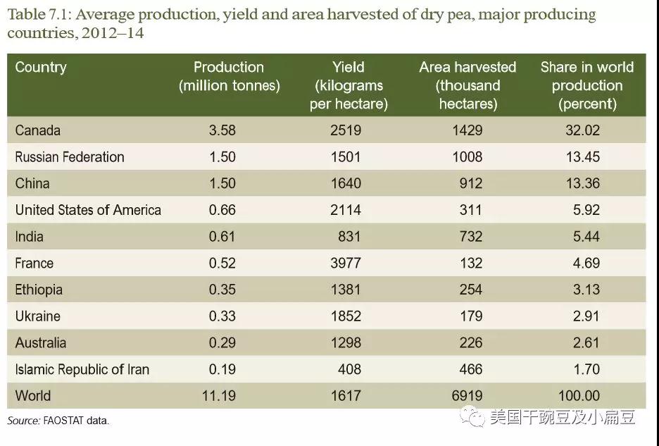 該報(bào)告指出,在2011-2013年中,干豌豆的主產(chǎn)地分別是加拿大、俄羅斯、中國、美國、印度、法國、埃塞俄比亞、烏克蘭、澳大利亞和伊朗,其中加拿大(32%)、俄羅斯(13%)和中國(13%)占了全球產(chǎn)量的58%。干豌豆產(chǎn)量整體呈下降趨勢(shì),尤其中國的產(chǎn)量下降尤為明顯。中國已經(jīng)成為干豌豆的純進(jìn)口。