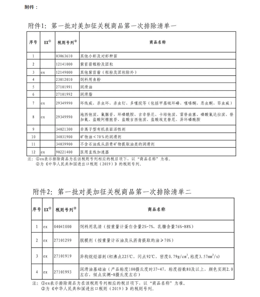 根據(jù)《國務(wù)院關(guān)稅稅則委員會關(guān)于試行開展對美加征關(guān)稅商品排除工作的公告》(稅委會公告〔2019〕2號),國務(wù)院關(guān)稅稅則委員會組織對申請主體提出的有效申請進行審核,并按程序決定,對第一批對美加征關(guān)稅商品,第一次排除部分商品,分兩個清單實施排除措施。有關(guān)事項公告如下: