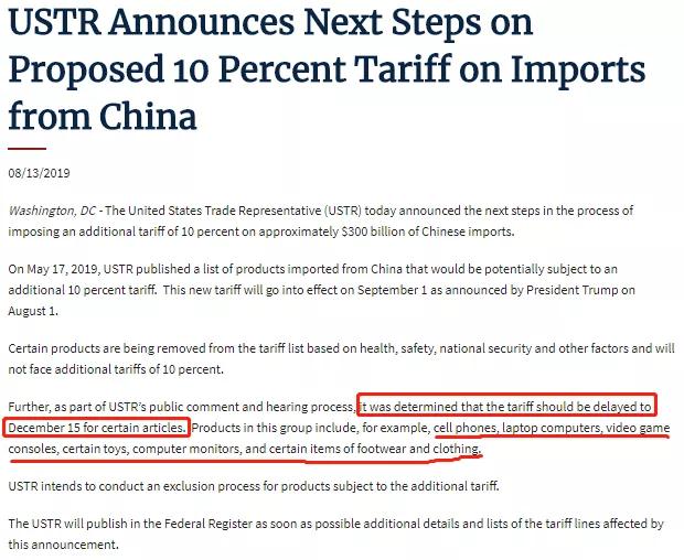 - 推遲了手機、筆記本電腦、游戲機、部分玩具、電腦顯示器、部分衣服鞋帽等占比59%的商品的征稅日期至12月15日;