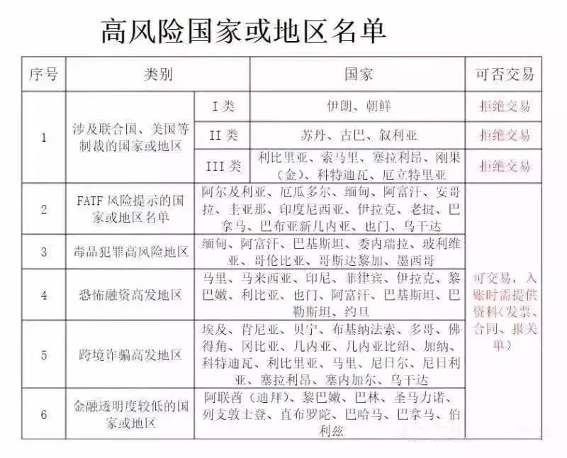 包括伊朗、蘇丹、朝鮮、敘利亞、古巴。這5個(gè)國(guó)家是受聯(lián)合國(guó)/美國(guó)制裁的,國(guó)內(nèi)大部分銀行拒絕辦理這些國(guó)家的任何國(guó)際業(yè)務(wù)。