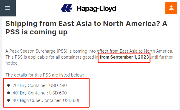 8日,赫伯羅特官網(wǎng)發(fā)布公告稱,自9月1日起,由東亞地區(qū)(包括中國(guó))運(yùn)往北美的貨物征收旺季附加費(fèi)PSS(Peak Season Surcharge),PSS征收標(biāo)準(zhǔn):20尺柜:480美元,40尺及高柜600美元。