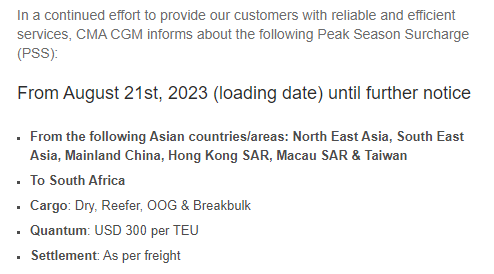 此前,達(dá)飛也曾宣布征收旺季附加費(fèi)!7月20日,達(dá)飛發(fā)布公告,稱自2023年8月21日(裝貨日期)起,對(duì)來(lái)自東北亞、東南亞、中國(guó)大陸、中國(guó)香港特別行政區(qū)和中國(guó)澳門特別行政區(qū)、中國(guó)臺(tái)灣地區(qū)前往南非的干箱、冷藏箱、超重貨物和散雜貨,每TEU征收300美元。