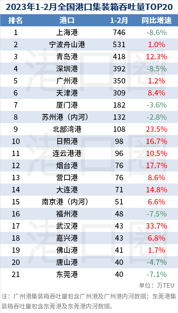 1-2月,全國(guó)港口集裝箱吞吐量前十名為:上海港(第1)、寧波舟山港(第2)、青島港(第3)、深圳港(第4)、廣州港(第5)、天津港(第6)、廈門(mén)港(第7)、蘇州港(第8)、北部灣港(第9)、日照港(第10)。