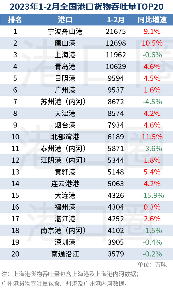 1-2月,全國(guó)港口貨物吞吐量前十名為:寧波舟山港(第1)、唐山港(第2)、上海港(第3)、青島港(第4)、日照港(第5)、廣州港(第6)、蘇州港(第7)、天津港(第8)、煙臺(tái)港(第9)、北部灣港(第10)。