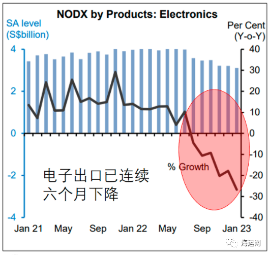 非石油國內(nèi)出口NODX當(dāng)中,電子類和非電子類雙雙萎縮。其中,電子業(yè)出口跌幅從去2022年12月17.9%擴大至26.8%(已連續(xù)六個月萎縮);非電子業(yè)出口的年比跌幅從21.3%擴大至24.5%。與此可看,新加坡跟香港一樣,外貿(mào)數(shù)據(jù)并不好看,全方位萎縮惡化。