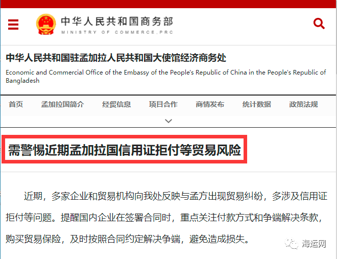 日前,中華人民共和國(guó)駐孟加拉人民共和國(guó)大使館經(jīng)濟(jì)商務(wù)處發(fā)布安全風(fēng)險(xiǎn)提醒:近期,多家企業(yè)和貿(mào)易機(jī)構(gòu)向我處反映與孟方出現(xiàn)貿(mào)易糾紛,多涉及信用證拒付等問題。提醒國(guó)內(nèi)企業(yè)在簽署合同時(shí),重點(diǎn)關(guān)注付款方式和爭(zhēng)端解決條款,購買貿(mào)易保險(xiǎn),及時(shí)按照合同約定解決爭(zhēng)端,避免造成損失。