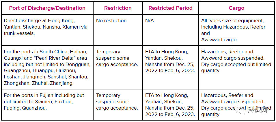 ONE發(fā)布通知稱,考慮到這種情況,將暫停接收所有開往華南地區(qū)和福建港口的OOG、危險(xiǎn)品箱、冷藏箱貨物(即由沿海支線運(yùn)營商提供服務(wù),預(yù)計(jì)到達(dá)主要港口的日期為2022年12月25日至2023年2月6日)。