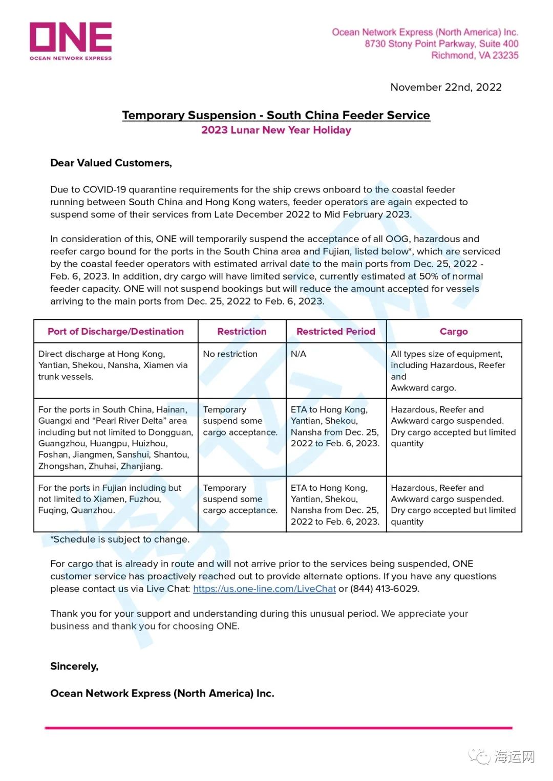 ONE:春節(jié)期間暫停接收運(yùn)往華南的貨物