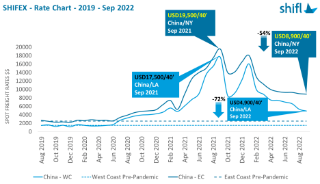 “金九銀十”的說法在全球海運(yùn)業(yè)曾經(jīng)也同樣適用,不過在今年的傳統(tǒng)旺季,海運(yùn)市場卻遭受陣陣寒流。主要海運(yùn)航線的運(yùn)價(jià)“斷崖式”暴跌,去年一飛沖天的海運(yùn)市場徹底“涼”了,現(xiàn)在海運(yùn)市場已經(jīng)從“賣方市場”轉(zhuǎn)變成為“買方市場”了。