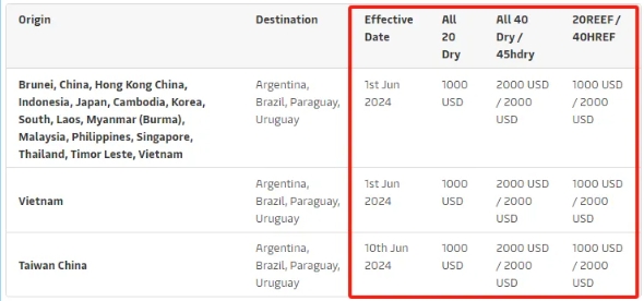 - 華南地區(qū):2024年5月15日(裝貨日期)起,每20英尺干箱500美元。2024年5月18日(裝貨日期)起,每20英尺干箱1500美元。