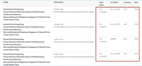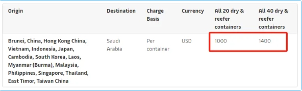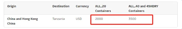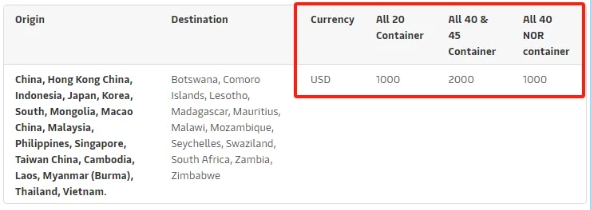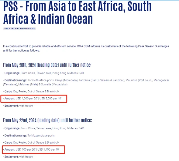 - 2024年5月20日(裝貨日期)起,至南非港口、肯尼亞(蒙巴薩)、坦桑尼亞(達累斯薩拉姆和桑給巴爾)、毛里求斯(路易港)、馬達加斯加(塔馬塔夫)、馬爾代夫(馬累)和索馬里(摩加迪沙)的干箱、冷藏箱、超限貨物和散雜箱,每20英尺箱1000美元、每40英尺箱2000美元。