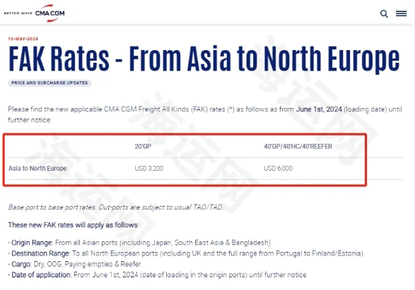 達飛官網(wǎng)發(fā)布通知稱,2024年6月1日起(始發(fā)港裝貨日期),調(diào)整從亞洲到北歐新的FAK費率,高達6000美元/FEU。