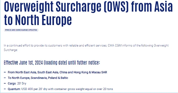 達飛自2024年6月1日(裝載日期)起,征收亞洲至北歐超重附加費(OWS),集裝箱毛重等于或超過20噸,每20英尺干散貨箱400美元,直至另行通知
