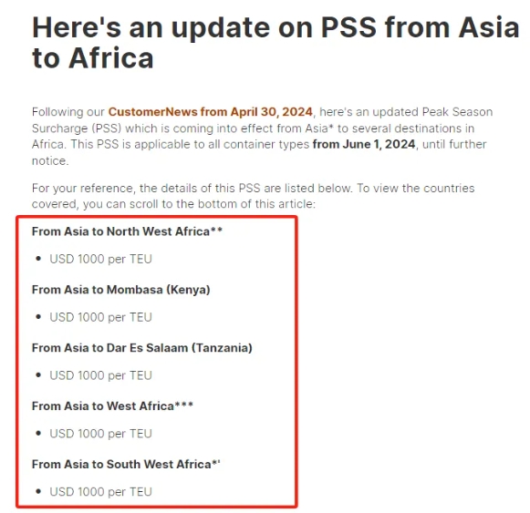 馬士基宣布6月1日起,征收至博茨瓦納、科摩羅群島、萊索托、馬達加斯加、毛里求斯、馬拉維、莫桑比克、塞舌爾、斯威士蘭、南非、贊比亞、津巴布韋的旺季附加費-PSS,所有20尺箱和40尺冷代干箱征收1000美元PSS、所有40尺和45尺高柜征收高達2000美元PSS。