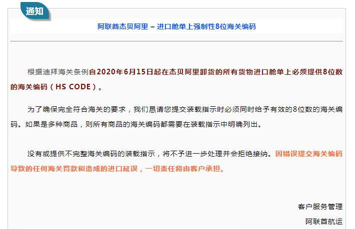 根據(jù)迪拜海關條例自2020年6月15日起在杰貝阿里卸貨的所有貨物進口艙單上必須提供8位數(shù)的海關編碼(HS CODE)。為了確保完全符合海關的要求,在提交裝載指示時必須同時給予有效的8位數(shù)的海關編碼。如果是多種商品,則所有商品的海關編碼都需要在裝載指示中明確列出。