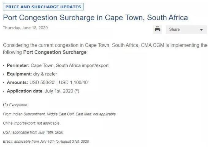 日前,船公司CMA CGM宣布,將對開普敦的干貨集裝箱和冷藏集裝箱收取擁堵費(fèi),550美元/20尺柜,1100美元/40尺柜,7月1日生效。
