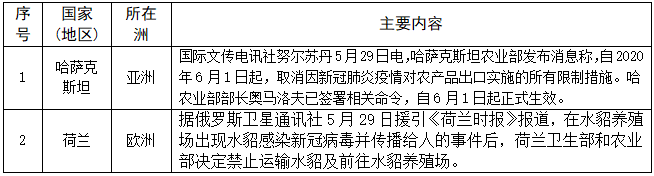 對貨物貿易(除醫(yī)療物資外)采取措施的情況——截至6月1日,共有54個國家(地區(qū))采取相關措施。本期更新2個國家,其中哈薩克斯坦取消因新冠肺炎疫情對農產品出口實施的所有限制措施。