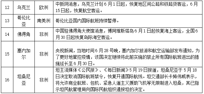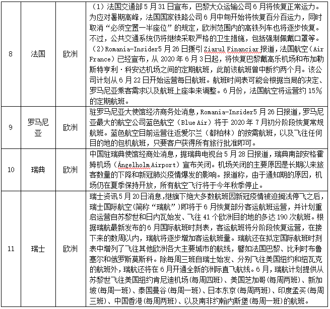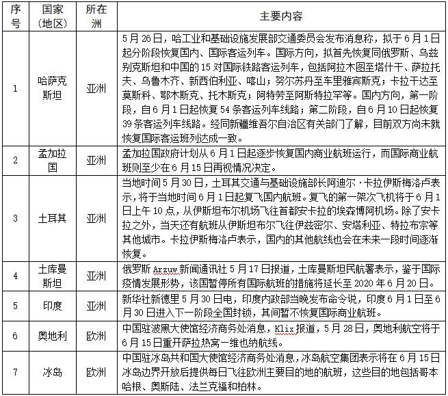 對船舶/航班/列車采取措施的情況——截至6月1日,共有148個國家(地區(qū))采取了相關措施。本期更新16個國家,其中哈薩克斯坦恢復國內、國際客運列車;孟加拉國、土耳其、奧地利、冰島、法國、羅馬尼亞、瑞士、烏克蘭、坦桑尼亞恢復部分航班;佛得角恢復海上客運。具體如下: