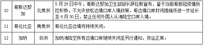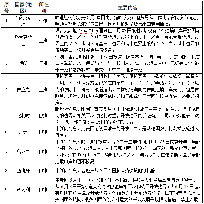 對邊境口岸采取措施的情況——截至6月1日,共有102個國家(地區(qū))采取了相關措施。本期更新12個國家,其中哈薩克斯坦、塔吉克斯坦、伊朗、伊拉克、比利時、丹麥、烏克蘭、西班牙、意大利逐步開放邊境口岸。具體如下: