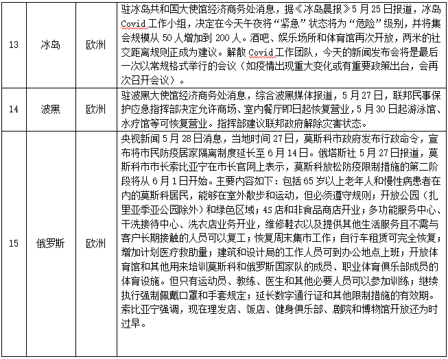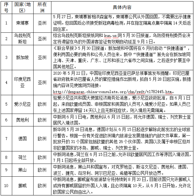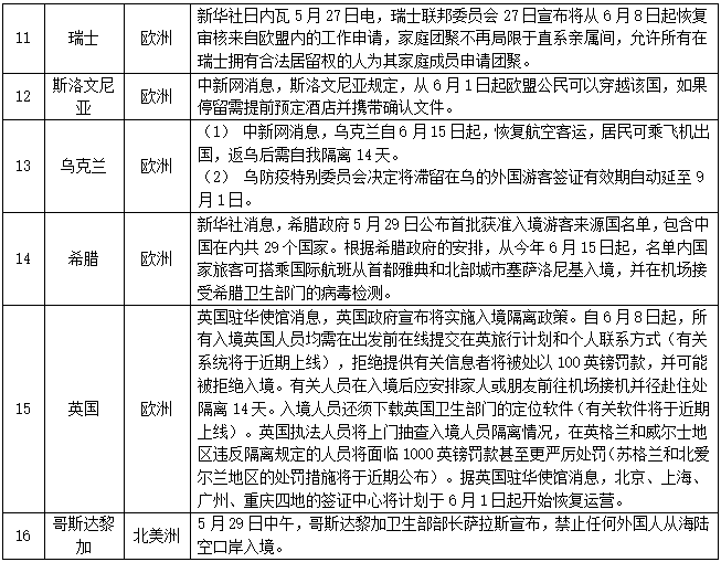 對人員入境采取措施的情況——截至6月1日,共有178個國家(地區(qū))采取了相關措施。本期更新16個國家,其中新加坡和中國將在6月初啟動“快捷通道”;愛沙尼亞、奧地利、德國、荷蘭、黑山、挪威、瑞士、斯洛文尼亞、希臘允許部分外國人入境;烏克蘭簽證有效期自動延期。具體如下: