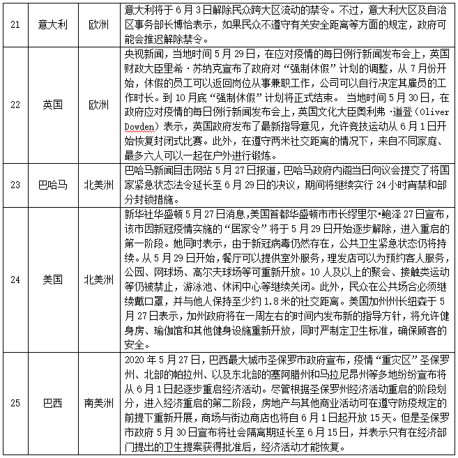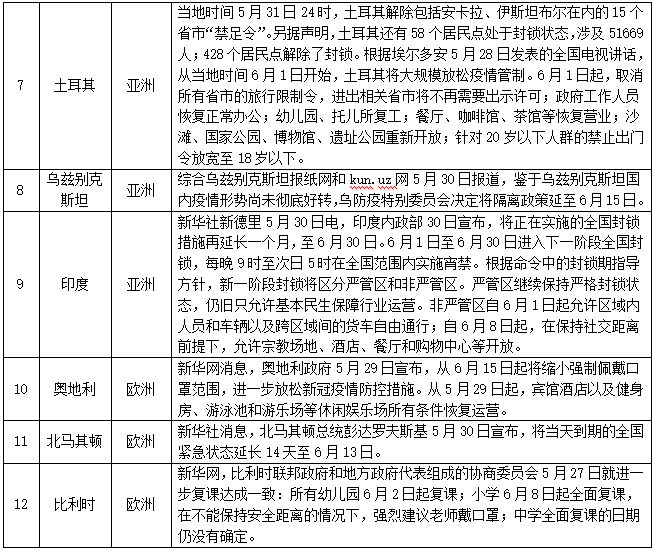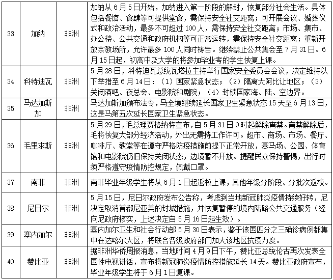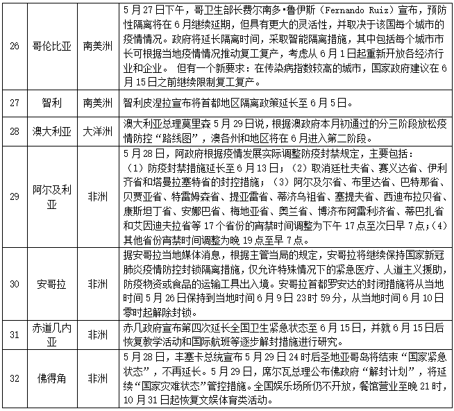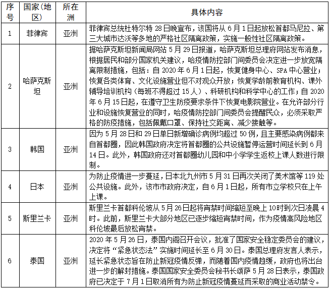 宣布進入緊急狀態(tài)等情況的國家(地區(qū))——截至6月1日,共有151個國家(地區(qū))采取了相關措施。本期更新40個國家(地區(qū)),其中菲律賓、哈薩克斯坦、斯里蘭卡、泰國、土耳其、印度、奧地利、比利時、冰島、波黑、俄羅斯、法國、羅馬尼亞、瑞士、意大利、英國、美國、巴西、哥倫比亞、澳大利亞、阿爾及利亞、安哥拉、佛得角、加納、毛里求斯、南非、尼日爾、贊比亞28個國家放松部分管制措施,啟動不同程度的復工復產復課。具體情況如下: