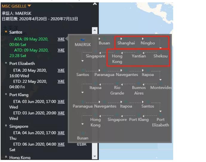 ▲該輪船期,曾掛靠上海、寧波、蛇口、鹽田港