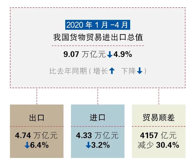 據(jù)海關(guān)統(tǒng)計(jì),今年前4個(gè)月,我國(guó)貨物貿(mào)易進(jìn)出口總值9.07萬億元人民幣,比去年同期(下同)下降4.9%,降幅比一季度收窄1.5個(gè)百分點(diǎn)。其中,出口4.74萬億元,下降6.4%;進(jìn)口4.33萬億元,下降3.2%;貿(mào)易順差4157億元,減少30.4%。