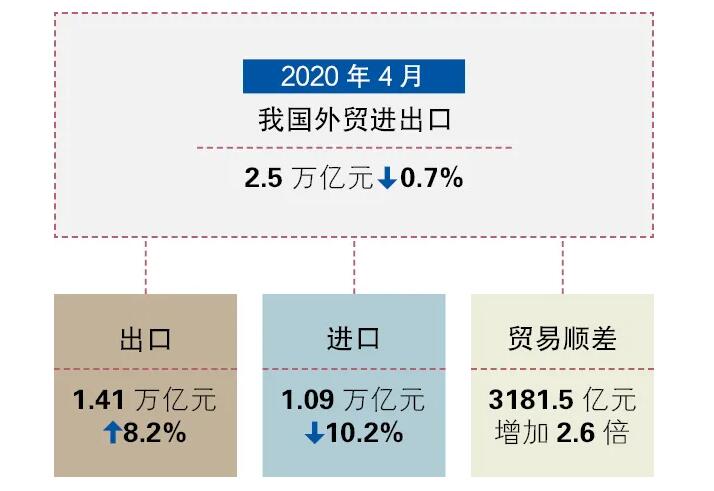 4月份,我國(guó)外貿(mào)進(jìn)出口2.5萬億元,同比微降0.7%;其中,出口1.41萬億元,增長(zhǎng)8.2%;進(jìn)口1.09萬億元,下降10.2%;貿(mào)易順差3181.5億元,增加2.6倍。