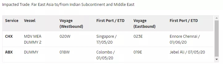 東岸中國(guó) 2 (ECC2) 掛靠次序: 青島 > 寧波 > 上海 > 釜山 > 科隆 > 薩凡納 >查爾斯頓 > 波士頓 > 紐約 > 科隆 > 青島 取消于 四月二十八日 由青島出發(fā)的航次 東岸快航 1 (ECX1) 掛靠次序: 蓋梅港 > 香港 > 鹽田 > 廈門 > 上海 > 科隆 > 紐約 > 薩凡納 >查爾斯頓 > 蓋梅港 取消于 四月十六日四月十三日及四月二十七日 由蓋梅港出發(fā)的航次