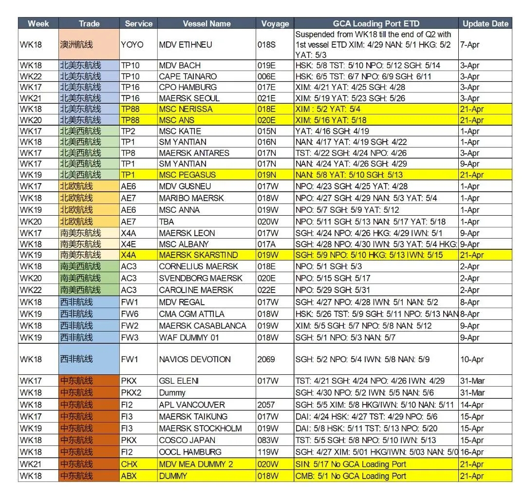 越南中國(guó)服務(wù) (VCS) 掛靠次序( 至四月三十日 ) : 林查班 > 蓋梅港 > 海防 > 南沙 > 香港 > 鹽田 > 長(zhǎng)灘 > 奧克蘭 > 連云港 > 上海 掛靠次序( 五月一日起生效 ) :林查班 >海防 >上海 > 寧波 > 長(zhǎng)灘 > 奧克蘭 > 連云港 > 上海 取消于 四月二十三日 由南沙出發(fā)及 五月十五日由上海出發(fā) 的航次 太平西北1 (PNW1) 掛靠次序: 蛇口 > 香港 > 鹽田 > 高雄 > 溫哥華 > 西雅圖 > 釜山 > 高雄 > 蛇口 取消于 五月二日 由蛇口出發(fā)的航次
