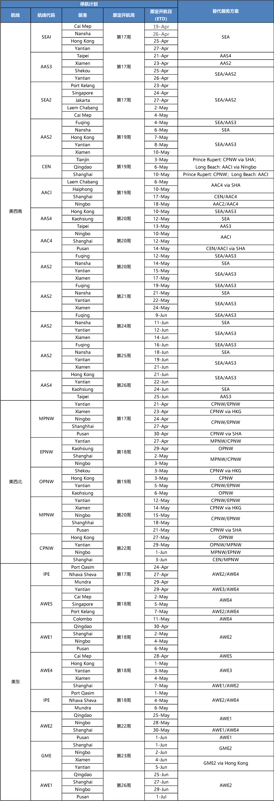 因預(yù)期市場(chǎng)需求下降, 以下是四月一日 發(fā)布的四至五月份泛太平洋航線航次取消信息的更新,新增及更改部分已作紅色標(biāo)記,請(qǐng)以本信息取代于四月一日 發(fā)布的泛太平洋航線服務(wù)信息。