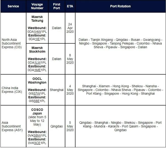 太平洋華南 1 (PCS1) 掛靠次序( 至五月十一日 ): 福清 > 南沙 >香港 > 鹽田 > 廈門 > 洛杉磯 > 奧克蘭 > 福清 掛靠次序( 五月十二日起生效 ): 福清 > 南沙 > 鹽田 > 廈門 > 洛杉磯> 福清 取消于四月五日,四月十二日 及四月二十六日,五月三日,五月十二日及五月十九日 由福清出發(fā)的航次 太平洋越南華南 (PVCS) 掛靠次序: 蓋梅港 > 香港 > 鹽田 > 高雄 > 長(zhǎng)灘 > 高雄 > 蓋梅港 取消于四月十六日由蓋梅港出發(fā)的航次 太平洋華中1 (PCC1) 掛靠次序: 寧波 > 上海 > 釜山> 長(zhǎng)灘 > 釜山 > 寧波 取消于五月九日由寧波出發(fā)的航次